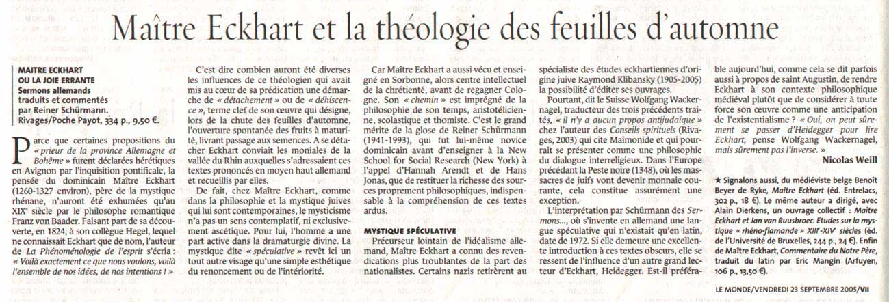 Le Monde Vendredi 23 septembre 2005 / VII - A propos de Maître Eckhart ou la joie errante. Sermons allemands traduits et commentés par Reiner Schürmann.