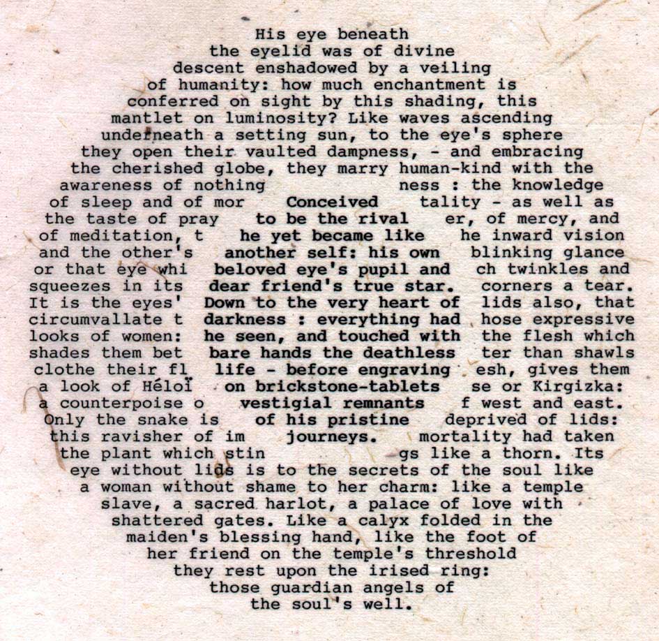 Wolfgang Wackernagel GILGAMESH'S IRISGLANCE (english) published in : Diogenes n° 156, New York - Oxford, Berg 1992 genre : calligramme concrete poetry
